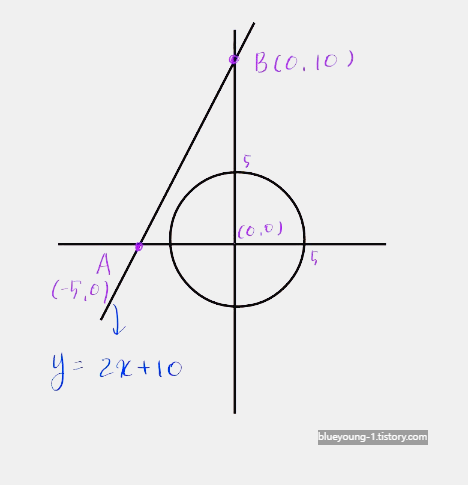 두 점 A( -5, 0 ), B( 0, 10 )을 지나는 직선 l는 y = 2x + 10이다. 2x - y +10 = 0 이므로 직선과 원 사이의 거리를 구하면 d = ∣ 10 ∣ / √5 = 2√5이다